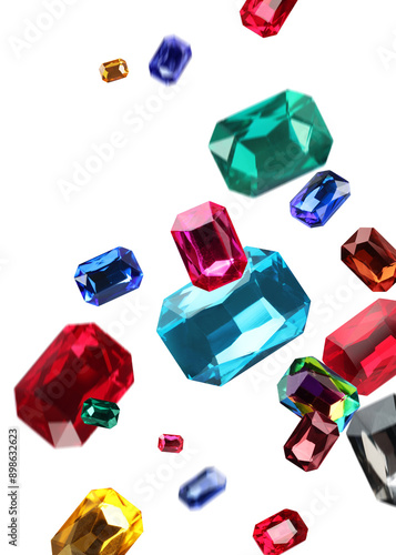 Many shiny gemstones in air on white background