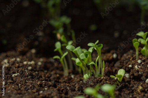 many small lettuce sprouts grow in the ground. home greenhouse