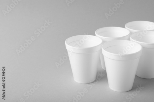 Many styrofoam cups on light grey background, space for text