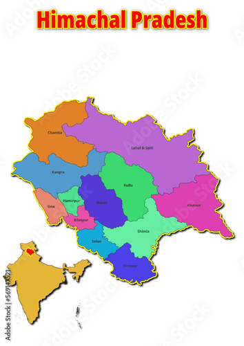 Map of Himachal Pradesh Union Territor with names of regions. Vector illustration of geographical map of Himachal Pradesh Union Territor depicted on the map of India.