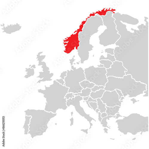 Map of Norway highligted with red in Europe map