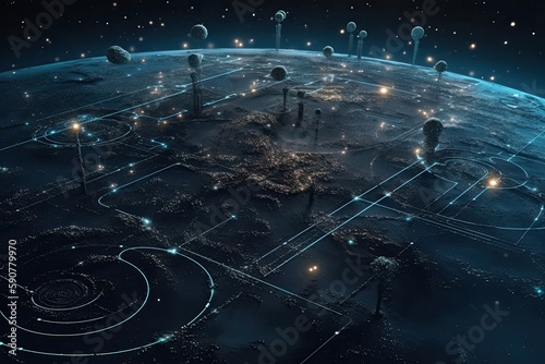 surreal, alien, boardwalk, symbol, three-dimensional, universe, nebula, planet, galaxy, dark background, realistic, space, extraterrestrial, cosmic, astronomy, night sky, outer space, science fiction, fantasy, futuristic, space exploration, mystical, abstract, intricate, intense, dreamlike, enigmatic, mysterious, starry, illuminated, mesmerizing, eerie, celestial, enchanting, galactic, futurism, symbolism, extravagant, spiritual, aethereal, illuminating, hypnotic, artificial intelligence