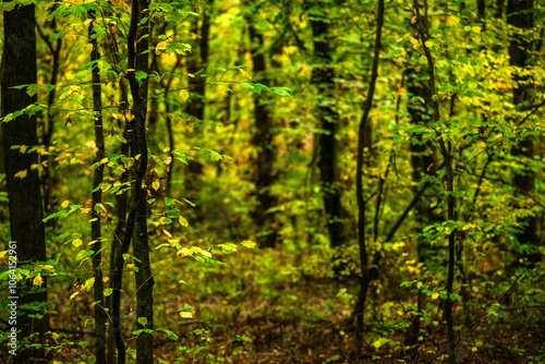 Maple forest at the autumn day,leaves on trees with beautiful colors.Mystery woodlands,yellow and green trees in the forest.Maple leaves.Landscape in the woods.Horizontical and vertical shots .