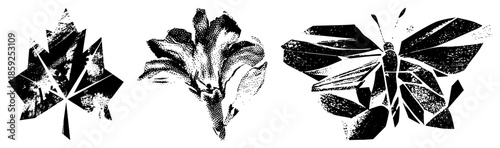 maple leaf, flower, butterfly, abstract, black-and-white, vector, geometric, halftone, stylised, botanical, graphic, design, illustration, art, texture, isolated, silhouette, negative space, graphic design, artwork, symbol, nature, organic, modern, minimalist, decorative