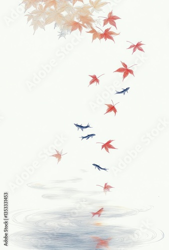 background, pattern, postcard, graphic, design, nature, maple, leaf, fish, wave, water, plover, bird, sea, animal, plant, traditional, art, minimalistic, japanese, soft, pastel, colours, composition, balance, airy, lighting, gradient, beautiful, scenery, elegant, flow, serenity, calm, decor, decorative, textile, inspiration, tranquil, artistic, watercolor, creative, symbolic