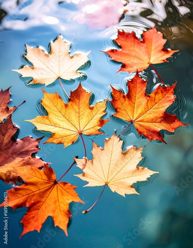 maple leaves floating on water surface, autumn foliage with translucent veins, clear reflection