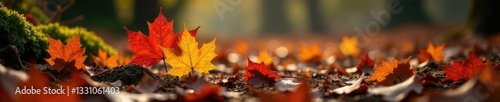 Maple leaves on the ground amidst fallen branches and twigs, forest, nature, leaves