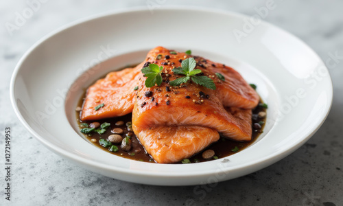 salmon, fish, seafood, main course, dinner, food photography, culinary, gastronomy, closeup, studio shot, white plate, plate