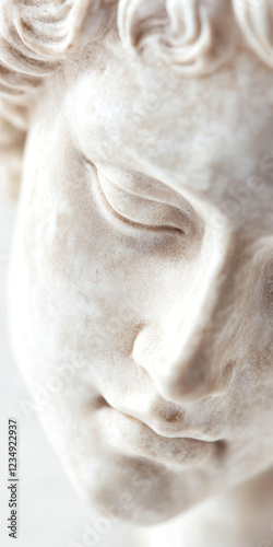 Marble sculpture of serene adult man with detailed classical features in soft focus close up