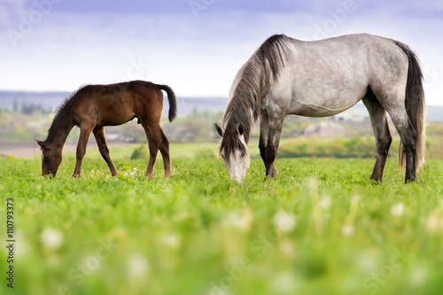 Mare with colt grazing on pasture