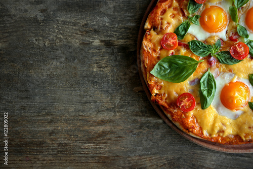 Margarita pizza with basil leaves and egg on wooden background