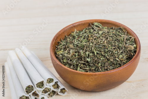 Marijuana or weed or cannabis on wooden bowl and in the rolled joint.