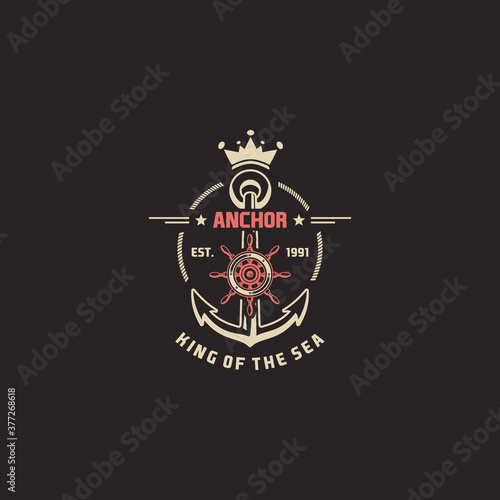 Marine round retro emblem in hipster style with anchor and inscriptions. Worn texture on a separate layer and can be disabled