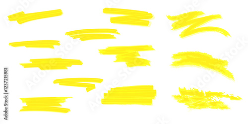 Marker yellow set, brush pen hand drawn underline. Highlighter collection, brush lines, isolated. Vector highlighter graphic stylish element. Watercolor yellow hand drawn highlight set.