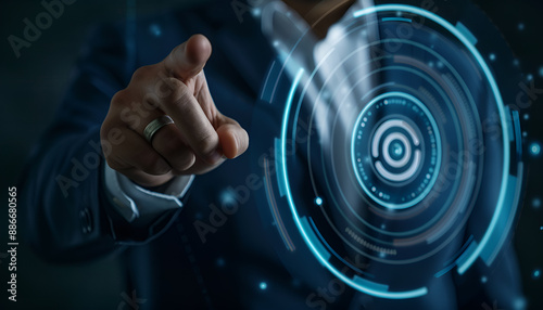 Marketing concept. Businessman pointing at target on digital screen against color background, closeup