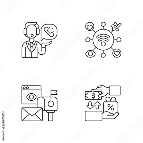 Marketing strategies linear icons set. Using telephone to reach different audiences and promote. Customizable thin line contour symbols. Isolated vector outline illustrations. Editable stroke