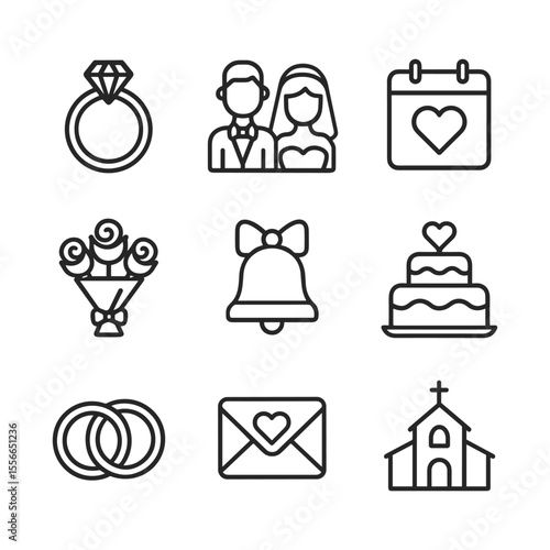 icon, marriage, line, ceremony, wedding, party, celebration, love, romance, couple, bride, groom, ring, diamond, engagement, flower, bouquet, dress, suit, church, vector, signs, symbol, outline, black, set, venue, reception, cake, decoration, invitation, gift, heart, romantic, anniversary, union, commitment, vow, altar, chapels, white, elegant, special, event, festive, happy, joy