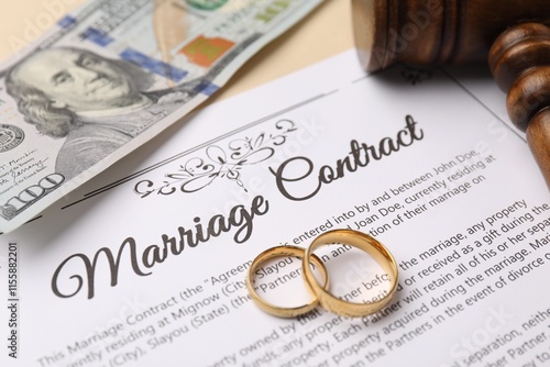 Marriage contract, gavel, dollar bill and golden rings on beige background, closeup