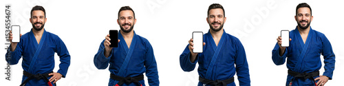 Martial Artist in Blue Gi Holding Smartphone Transparent Background