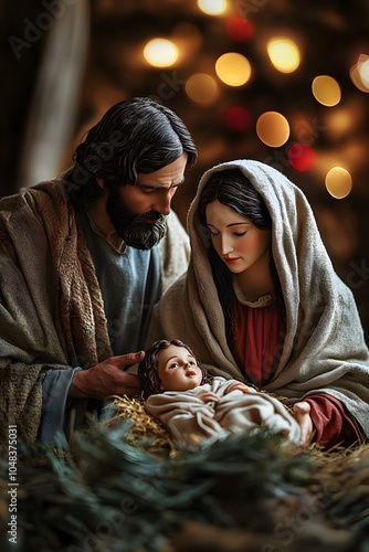 Mary and joseph admiring their son in a christmas nativity scene depicting the birth of jesus