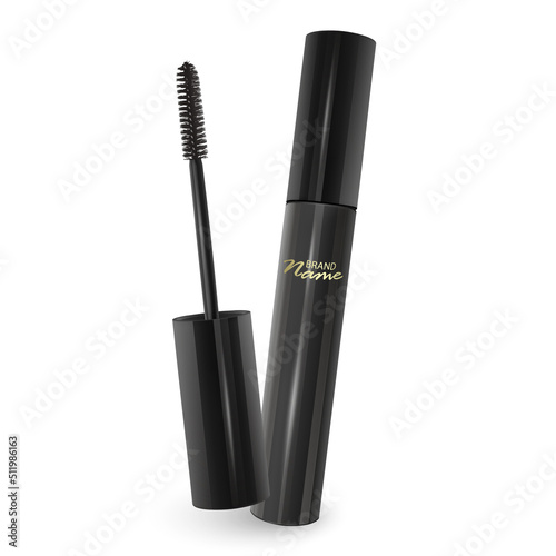 Mascara tube and a wand applicator. Cosmetic black bottle with eyelash brush. Isolated on white background. Realistic vector illustration