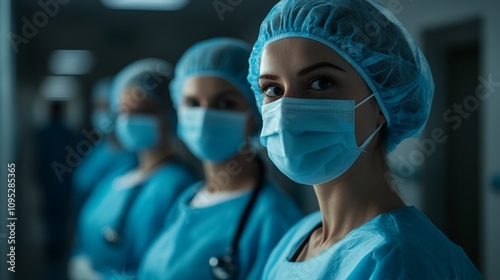 Masked Medical Professionals Standing at the Ready.Concept of Healthcare, pandemic, frontline workers, dedication, resilience,Healthcare, medical equipment, pharmaceutical, mental health