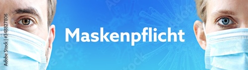 Maskenpflicht. Gesichter von Mann und Frau mit Mundschutz. Paar mit Maske vor blauen Hintergrund mit Text. Virus, Atemmaske, Corona