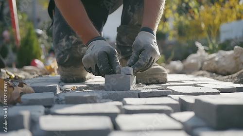 Mason building a stone patio in a garden. Featuring stone patio construction