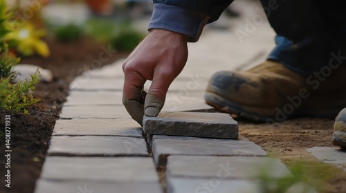 mason, installing, stone, paving, garden, path, craftsmanship, care, masonry, work, landscaping, optical, hand, stone, setting, visible