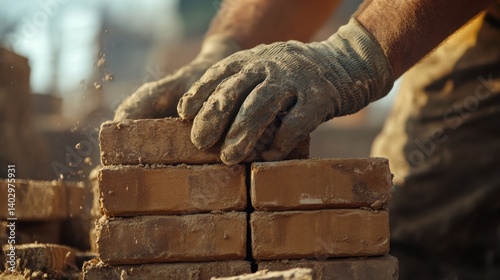 Mason laying bricks with precision. Featuring craftsmanship and focus