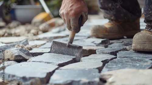 mason, laying, stone, patio, construction, installation, landscaping, building, project, design, masonry, optical, men at work, hammer, place, stone