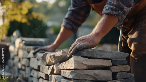 Mason laying stones for a decorative wall at a garden. Featuring craftsmanship and focus