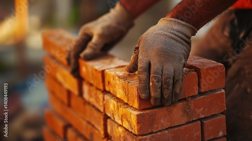 Mason placing bricks in a wall at a construction site. Featuring craftsmanship and attention to detail