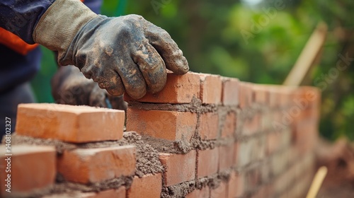 Masonry worker placing bricks for a new garden wall. Featuring craftsmanship and attention to detail