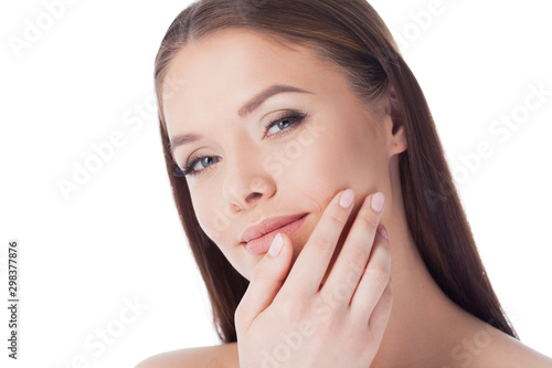Massage your face. Use face cream and serum. Portrait of young beautiful woman isolated on white.
