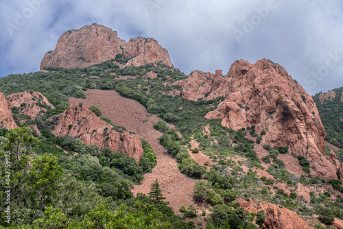Massif de l'Esterel, a volcanic mountain range on the Mediterranean Sea coast on the French Riviera, located near Cannes on the east and Saint-Rafael on the west, France