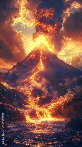 volcano, eruption, lava, magma, sunrise, fire, smoke, heat, nature, mountain, glowing, landscape, explosion, ash, molten, stream, earth, energy, sky, flames, power, outdoors, cloud, sunset, cloud, mountain, snow, peak, travel, red, sun, night, summer