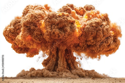 explosion, bomb, fire, smoke, detonation, blast, orange, brown, dust, cloud, power, energy, destruction, disaster, white background, graphic, impact, powerful, violent, large, big, aerial, closeup, isolated, desert, sand, fireball, heat, damage, war, conflict, dangerous, hazardous, intense, flames