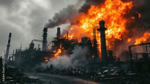 fire, industrial, refinery, smoke, flames, explosion, factory, blaze, pollution, chimney, destruction, crisis, disaster, danger, inferno, emergency, safety, damage, thick, cloud, gas, environmental, towering, powerful, intense, oil, industrialization, apocalyptic, debris, sky, impact, response, sky, orange, landscape, environment, massive, burning, heat, urban, dramatic, ash, hazard, structure, catastrophy, dark, emission