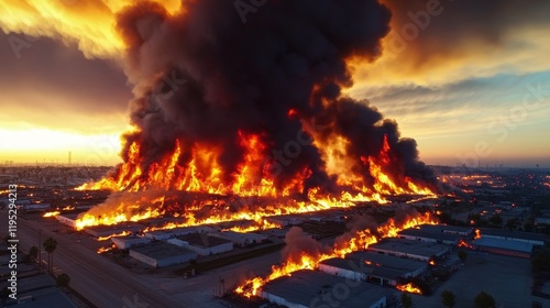 Massive Industrial Fire Inferno - Aerial view of a large industrial fire at sunset, intense flames and smoke billowing into the sky.
