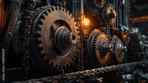Massive industrial machine with exposed gears and chains, dark workshop lighting