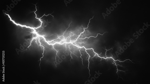 Massive lightning bolt illuminates the darkness with its branched brilliance, casting an electrifying glow against the pitch-black canvas.