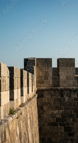 Massive stone ramparts and thick battlements show the imposing strength of historical defensive architecture standing against a clear sky, battlement, defensive, tourism