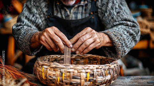 Master artisan skillfully weaves a basket in a workshop using traditional techniques and natural materials