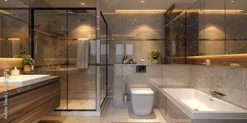bathroom, shower, bathtub, vanity, mirror, tile, wood, glasses, chrome, interior, home