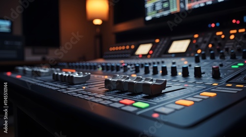 Mastering the Mix: A Close-Up of a Professional Audio Mixing Console in a Recording Studio.