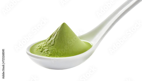 Matcha green tea powder in wooden spoon, isolated on transparent background
