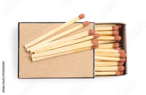Matches and box isolated on white, top view