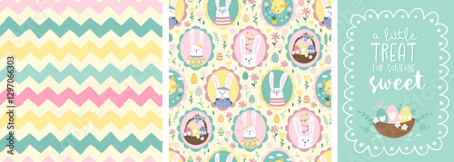 Matching Easter pattern with fun hand drawn Easter Bunnies, vintage style bunnies in cute frames, great for textiles, banners, wallpapers - vector design