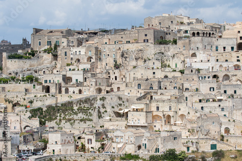 Matera, Italy - May 20, 2017: Panoramic view of the city from the belvedere square with background the clouds in the sky
